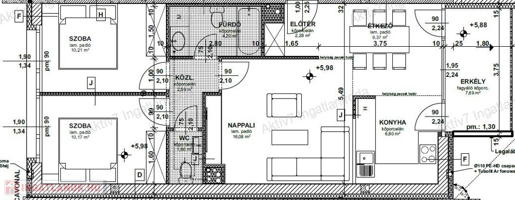 A szóban forgó lakás ( 5 ) második emeleti, 63,30 m2 területű, amerikai konyha nappali +2 hálószobás , fürdőszoba- WC-vel , és WC külön helyiségben is ,7,69 m2 erkéllyel (a fotók között található alaprajz szerint).